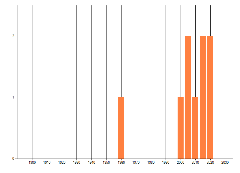 Het aantal atlasblokken (5x5 km) waarin de soort is gemeld binnen een periode van vijf jaar (vanaf 1980) of twintig jaar. Niet gecorrigeerd voor waarnemersinspanning en het aantal doorgegeven waarnemingen kan sterk variëren per periode, dus een trend in verspreiding kan hier niet direct uit worden afgelezen. Het opgegeven jaartal is het eerste jaar van de periode. Bron: gevalideerde waarnemingen uit de NDFF.
