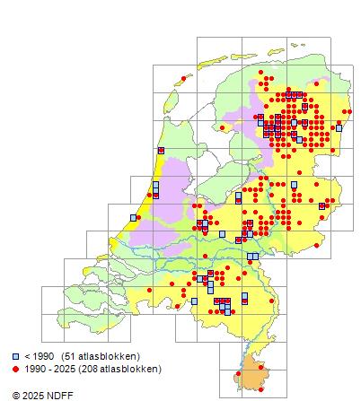 Het aantal atlasblokken (5x5 km) waarin de soort is gemeld binnen een periode van vijf jaar (vanaf 1980) of twintig jaar. Niet gecorrigeerd voor waarnemersinspanning en het aantal doorgegeven waarnemingen kan sterk variëren per periode, dus een trend in verspreiding kan hier niet direct uit worden afgelezen. Het opgegeven jaartal is het eerste jaar van de periode. Bron: gevalideerde waarnemingen uit de NDFF.