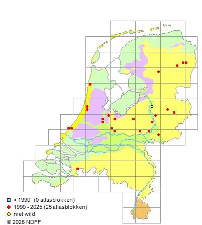 Het aantal atlasblokken (5x5 km) waarin de soort is gemeld binnen een periode van vijf jaar (vanaf 1980) of twintig jaar. Niet gecorrigeerd voor waarnemersinspanning en het aantal doorgegeven waarnemingen kan sterk variëren per periode, dus een trend in verspreiding kan hier niet direct uit worden afgelezen. Het opgegeven jaartal is het eerste jaar van de periode. Bron: gevalideerde waarnemingen uit de NDFF.