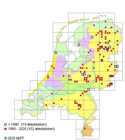 Het aantal atlasblokken (5x5 km) waarin de soort is gemeld binnen een periode van vijf jaar (vanaf 1980) of twintig jaar. Niet gecorrigeerd voor waarnemersinspanning en het aantal doorgegeven waarnemingen kan sterk variëren per periode, dus een trend in verspreiding kan hier niet direct uit worden afgelezen. Het opgegeven jaartal is het eerste jaar van de periode. Bron: gevalideerde waarnemingen uit de NDFF.