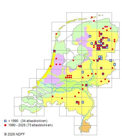 Het aantal atlasblokken (5x5 km) waarin de soort is gemeld binnen een periode van vijf jaar (vanaf 1980) of twintig jaar. Niet gecorrigeerd voor waarnemersinspanning en het aantal doorgegeven waarnemingen kan sterk variëren per periode, dus een trend in verspreiding kan hier niet direct uit worden afgelezen. Het opgegeven jaartal is het eerste jaar van de periode. Bron: gevalideerde waarnemingen uit de NDFF.