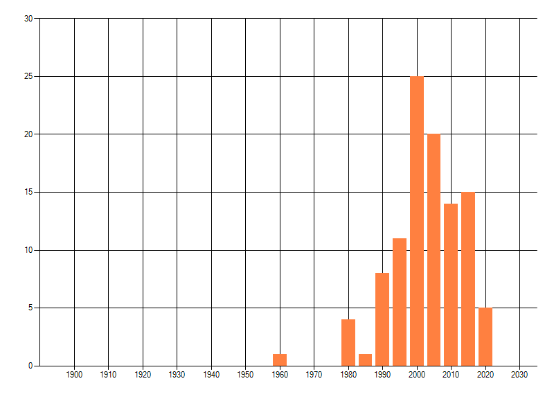 Het aantal atlasblokken (5x5 km) waarin de soort is gemeld binnen een periode van vijf jaar (vanaf 1980) of twintig jaar. Niet gecorrigeerd voor waarnemersinspanning en het aantal doorgegeven waarnemingen kan sterk variëren per periode, dus een trend in verspreiding kan hier niet direct uit worden afgelezen. Het opgegeven jaartal is het eerste jaar van de periode. Bron: gevalideerde waarnemingen uit de NDFF.