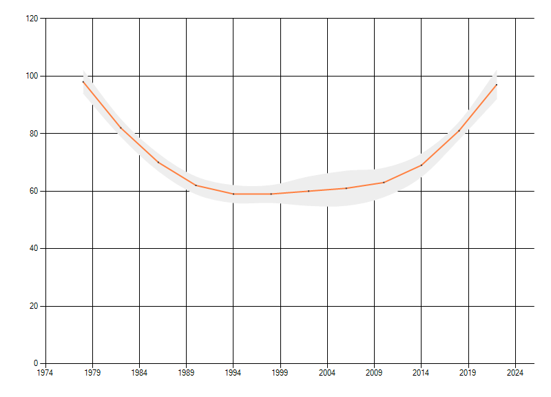 Gemiddelde trend van het aantal kilometerhokken waarin de soort voorkomt, weergegeven als indexcijfer (1975-1978 = 100). De trend is gecorrigeerd voor waarnemersinspanning en geeft de relatieve verandering in het aantal bezette kilometerhokken weer. Voor de berekening worden de data per periode van vier jaar samengenomen. In de grafiek correspondeert ieder punt met het laatste jaar van zo'n periode.