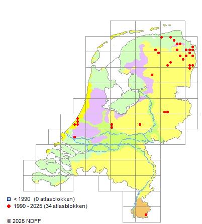 Het aantal atlasblokken (5x5 km) waarin de soort is gemeld binnen een periode van vijf jaar (vanaf 1980) of twintig jaar. Niet gecorrigeerd voor waarnemersinspanning en het aantal doorgegeven waarnemingen kan sterk variëren per periode, dus een trend in verspreiding kan hier niet direct uit worden afgelezen. Het opgegeven jaartal is het eerste jaar van de periode. Bron: gevalideerde waarnemingen uit de NDFF.