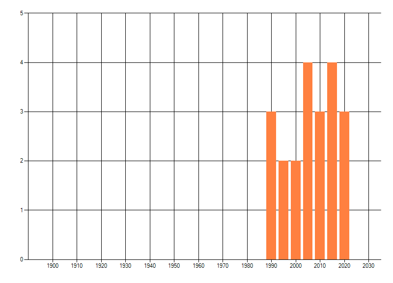 Het aantal atlasblokken (5x5 km) waarin de soort is gemeld binnen een periode van vijf jaar (vanaf 1980) of twintig jaar. Niet gecorrigeerd voor waarnemersinspanning en het aantal doorgegeven waarnemingen kan sterk variëren per periode, dus een trend in verspreiding kan hier niet direct uit worden afgelezen. Het opgegeven jaartal is het eerste jaar van de periode. Bron: gevalideerde waarnemingen uit de NDFF.