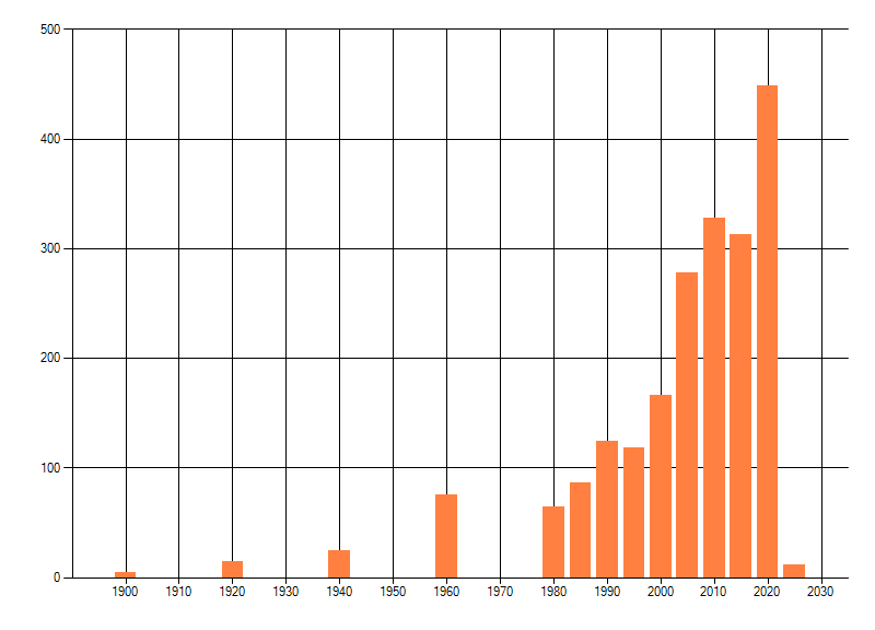 Het aantal atlasblokken (5x5 km) waarin de soort is gemeld binnen een periode van vijf jaar (vanaf 1980) of twintig jaar. Niet gecorrigeerd voor waarnemersinspanning en het aantal doorgegeven waarnemingen kan sterk variëren per periode, dus een trend in verspreiding kan hier niet direct uit worden afgelezen. Het opgegeven jaartal is het eerste jaar van de periode. Bron: gevalideerde waarnemingen uit de NDFF.
