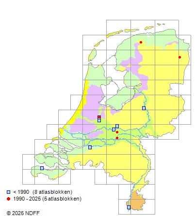Het aantal atlasblokken (5x5 km) waarin de soort is gemeld binnen een periode van vijf jaar (vanaf 1980) of twintig jaar. Niet gecorrigeerd voor waarnemersinspanning en het aantal doorgegeven waarnemingen kan sterk variëren per periode, dus een trend in verspreiding kan hier niet direct uit worden afgelezen. Het opgegeven jaartal is het eerste jaar van de periode. Bron: gevalideerde waarnemingen uit de NDFF.