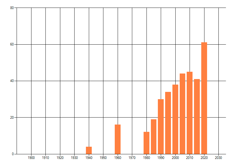 Het aantal atlasblokken (5x5 km) waarin de soort is gemeld binnen een periode van vijf jaar (vanaf 1980) of twintig jaar. Niet gecorrigeerd voor waarnemersinspanning en het aantal doorgegeven waarnemingen kan sterk variëren per periode, dus een trend in verspreiding kan hier niet direct uit worden afgelezen. Het opgegeven jaartal is het eerste jaar van de periode. Bron: gevalideerde waarnemingen uit de NDFF.