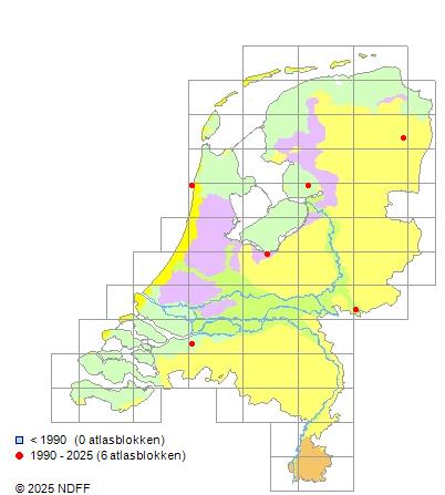 Het aantal atlasblokken (5x5 km) waarin de soort is gemeld binnen een periode van vijf jaar (vanaf 1980) of twintig jaar. Niet gecorrigeerd voor waarnemersinspanning en het aantal doorgegeven waarnemingen kan sterk variëren per periode, dus een trend in verspreiding kan hier niet direct uit worden afgelezen. Het opgegeven jaartal is het eerste jaar van de periode. Bron: gevalideerde waarnemingen uit de NDFF.