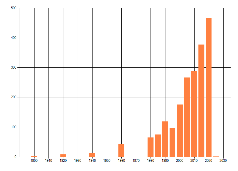 Het aantal atlasblokken (5x5 km) waarin de soort is gemeld binnen een periode van vijf jaar (vanaf 1980) of twintig jaar. Niet gecorrigeerd voor waarnemersinspanning en het aantal doorgegeven waarnemingen kan sterk variëren per periode, dus een trend in verspreiding kan hier niet direct uit worden afgelezen. Het opgegeven jaartal is het eerste jaar van de periode. Bron: gevalideerde waarnemingen uit de NDFF.