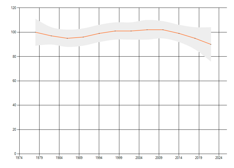 Gemiddelde trend van het aantal kilometerhokken waarin de soort voorkomt, weergegeven als indexcijfer (1975-1978 = 100). De trend is gecorrigeerd voor waarnemersinspanning en geeft de relatieve verandering in het aantal bezette kilometerhokken weer. Voor de berekening worden de data per periode van vier jaar samengenomen. In de grafiek correspondeert ieder punt met het laatste jaar van zo'n periode.
