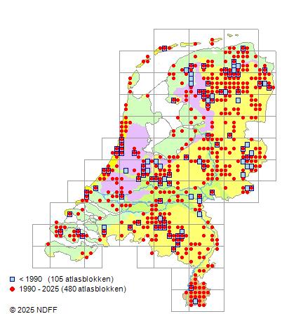 Het aantal atlasblokken (5x5 km) waarin de soort is gemeld binnen een periode van vijf jaar (vanaf 1980) of twintig jaar. Niet gecorrigeerd voor waarnemersinspanning en het aantal doorgegeven waarnemingen kan sterk variëren per periode, dus een trend in verspreiding kan hier niet direct uit worden afgelezen. Het opgegeven jaartal is het eerste jaar van de periode. Bron: gevalideerde waarnemingen uit de NDFF.