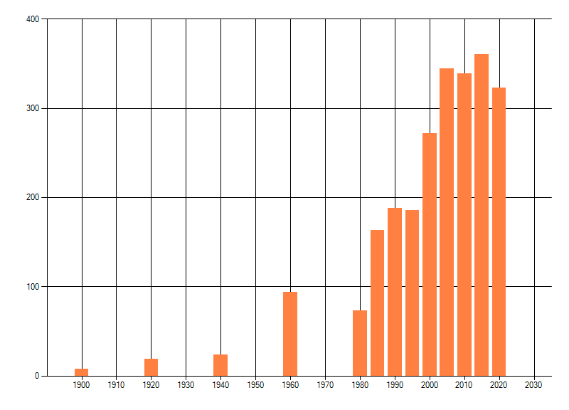 Het aantal atlasblokken (5x5 km) waarin de soort is gemeld binnen een periode van vijf jaar (vanaf 1980) of twintig jaar. Niet gecorrigeerd voor waarnemersinspanning en het aantal doorgegeven waarnemingen kan sterk variëren per periode, dus een trend in verspreiding kan hier niet direct uit worden afgelezen. Het opgegeven jaartal is het eerste jaar van de periode. Bron: gevalideerde waarnemingen uit de NDFF.