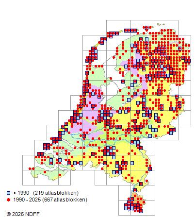Het aantal atlasblokken (5x5 km) waarin de soort is gemeld binnen een periode van vijf jaar (vanaf 1980) of twintig jaar. Niet gecorrigeerd voor waarnemersinspanning en het aantal doorgegeven waarnemingen kan sterk variëren per periode, dus een trend in verspreiding kan hier niet direct uit worden afgelezen. Het opgegeven jaartal is het eerste jaar van de periode. Bron: gevalideerde waarnemingen uit de NDFF.