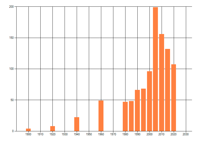 Het aantal atlasblokken (5x5 km) waarin de soort is gemeld binnen een periode van vijf jaar (vanaf 1980) of twintig jaar. Niet gecorrigeerd voor waarnemersinspanning en het aantal doorgegeven waarnemingen kan sterk variëren per periode, dus een trend in verspreiding kan hier niet direct uit worden afgelezen. Het opgegeven jaartal is het eerste jaar van de periode. Bron: gevalideerde waarnemingen uit de NDFF.