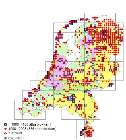 Het aantal atlasblokken (5x5 km) waarin de soort is gemeld binnen een periode van vijf jaar (vanaf 1980) of twintig jaar. Niet gecorrigeerd voor waarnemersinspanning en het aantal doorgegeven waarnemingen kan sterk variëren per periode, dus een trend in verspreiding kan hier niet direct uit worden afgelezen. Het opgegeven jaartal is het eerste jaar van de periode. Bron: gevalideerde waarnemingen uit de NDFF.