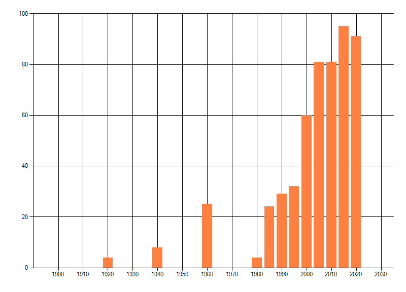 Het aantal atlasblokken (5x5 km) waarin de soort is gemeld binnen een periode van vijf jaar (vanaf 1980) of twintig jaar. Niet gecorrigeerd voor waarnemersinspanning en het aantal doorgegeven waarnemingen kan sterk variëren per periode, dus een trend in verspreiding kan hier niet direct uit worden afgelezen. Het opgegeven jaartal is het eerste jaar van de periode. Bron: gevalideerde waarnemingen uit de NDFF.