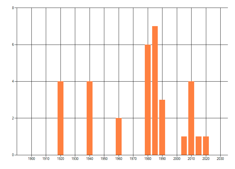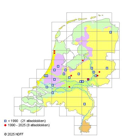 Het aantal atlasblokken (5x5 km) waarin de soort is gemeld binnen een periode van vijf jaar (vanaf 1980) of twintig jaar. Niet gecorrigeerd voor waarnemersinspanning en het aantal doorgegeven waarnemingen kan sterk variëren per periode, dus een trend in verspreiding kan hier niet direct uit worden afgelezen. Het opgegeven jaartal is het eerste jaar van de periode. Bron: gevalideerde waarnemingen uit de NDFF.