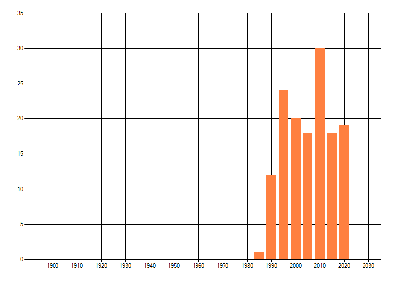 Het aantal atlasblokken (5x5 km) waarin de soort is gemeld binnen een periode van vijf jaar (vanaf 1980) of twintig jaar. Niet gecorrigeerd voor waarnemersinspanning en het aantal doorgegeven waarnemingen kan sterk variëren per periode, dus een trend in verspreiding kan hier niet direct uit worden afgelezen. Het opgegeven jaartal is het eerste jaar van de periode. Bron: gevalideerde waarnemingen uit de NDFF.