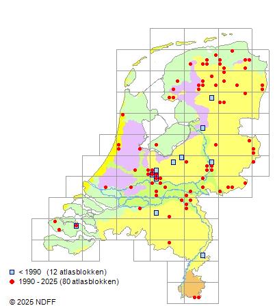 Het aantal atlasblokken (5x5 km) waarin de soort is gemeld binnen een periode van vijf jaar (vanaf 1980) of twintig jaar. Niet gecorrigeerd voor waarnemersinspanning en het aantal doorgegeven waarnemingen kan sterk variëren per periode, dus een trend in verspreiding kan hier niet direct uit worden afgelezen. Het opgegeven jaartal is het eerste jaar van de periode. Bron: gevalideerde waarnemingen uit de NDFF.