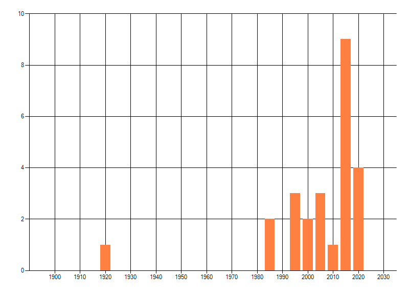 Het aantal atlasblokken (5x5 km) waarin de soort is gemeld binnen een periode van vijf jaar (vanaf 1980) of twintig jaar. Niet gecorrigeerd voor waarnemersinspanning en het aantal doorgegeven waarnemingen kan sterk variëren per periode, dus een trend in verspreiding kan hier niet direct uit worden afgelezen. Het opgegeven jaartal is het eerste jaar van de periode. Bron: gevalideerde waarnemingen uit de NDFF.