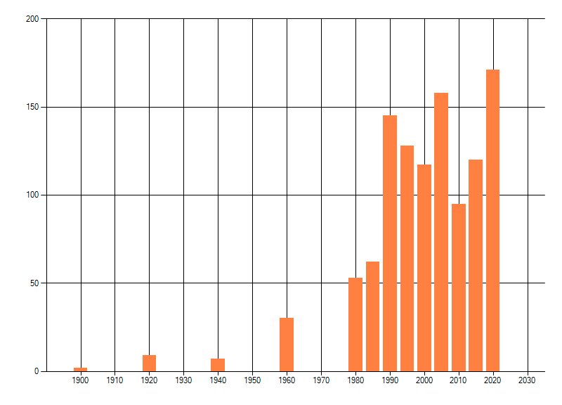 Het aantal atlasblokken (5x5 km) waarin de soort is gemeld binnen een periode van vijf jaar (vanaf 1980) of twintig jaar. Niet gecorrigeerd voor waarnemersinspanning en het aantal doorgegeven waarnemingen kan sterk variëren per periode, dus een trend in verspreiding kan hier niet direct uit worden afgelezen. Het opgegeven jaartal is het eerste jaar van de periode. Bron: gevalideerde waarnemingen uit de NDFF.