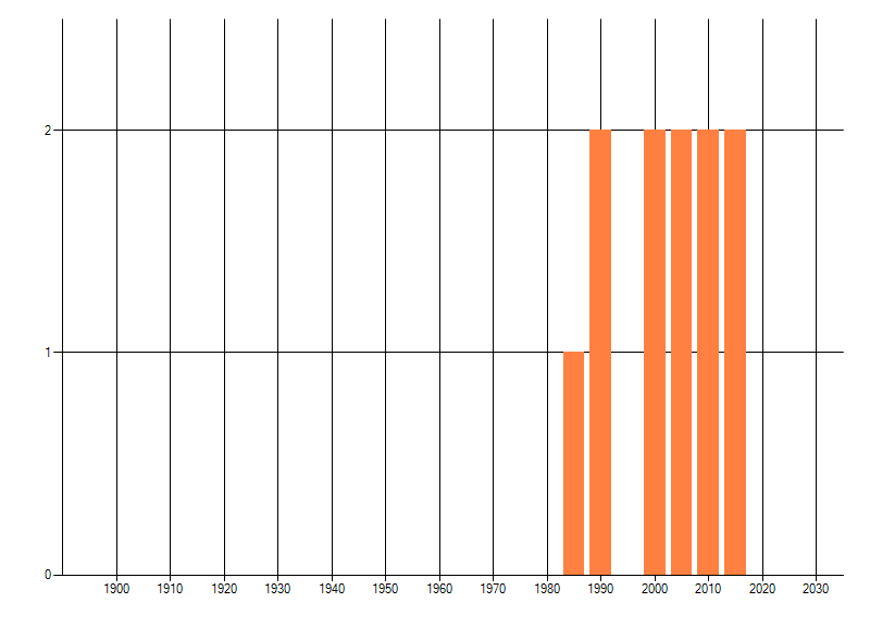 Het aantal atlasblokken (5x5 km) waarin de soort is gemeld binnen een periode van vijf jaar (vanaf 1980) of twintig jaar. Niet gecorrigeerd voor waarnemersinspanning en het aantal doorgegeven waarnemingen kan sterk variëren per periode, dus een trend in verspreiding kan hier niet direct uit worden afgelezen. Het opgegeven jaartal is het eerste jaar van de periode. Bron: gevalideerde waarnemingen uit de NDFF.