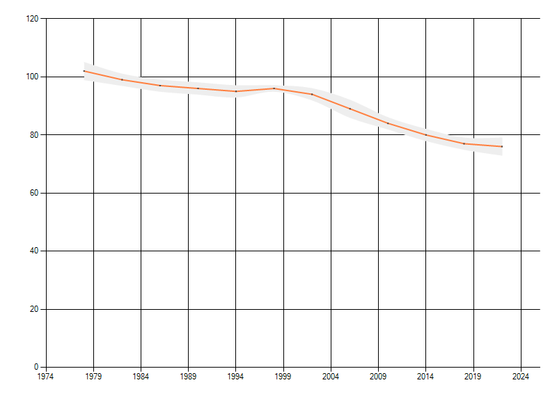 Gemiddelde trend van het aantal kilometerhokken waarin de soort voorkomt, weergegeven als indexcijfer (1975-1978 = 100). De trend is gecorrigeerd voor waarnemersinspanning en geeft de relatieve verandering in het aantal bezette kilometerhokken weer. Voor de berekening worden de data per periode van vier jaar samengenomen. In de grafiek correspondeert ieder punt met het laatste jaar van zo'n periode.