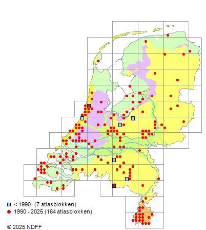 Het aantal atlasblokken (5x5 km) waarin de soort is gemeld binnen een periode van vijf jaar (vanaf 1980) of twintig jaar. Niet gecorrigeerd voor waarnemersinspanning en het aantal doorgegeven waarnemingen kan sterk variëren per periode, dus een trend in verspreiding kan hier niet direct uit worden afgelezen. Het opgegeven jaartal is het eerste jaar van de periode. Bron: gevalideerde waarnemingen uit de NDFF.