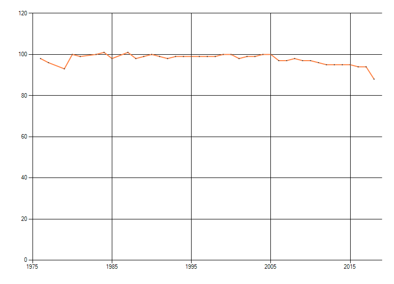 Gemiddelde trend van het aantal kilometerhokken waarin de soort voorkomt, weergegeven als indexcijfer (1975-1978 = 100). De trend is gecorrigeerd voor waarnemersinspanning en geeft de relatieve verandering in het aantal bezette kilometerhokken weer. Voor de berekening worden de data per periode van vier jaar samengenomen. In de grafiek correspondeert ieder punt met het laatste jaar van zo'n periode.