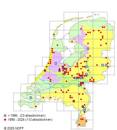 Het aantal atlasblokken (5x5 km) waarin de soort is gemeld binnen een periode van vijf jaar (vanaf 1980) of twintig jaar. Niet gecorrigeerd voor waarnemersinspanning en het aantal doorgegeven waarnemingen kan sterk variëren per periode, dus een trend in verspreiding kan hier niet direct uit worden afgelezen. Het opgegeven jaartal is het eerste jaar van de periode. Bron: gevalideerde waarnemingen uit de NDFF.