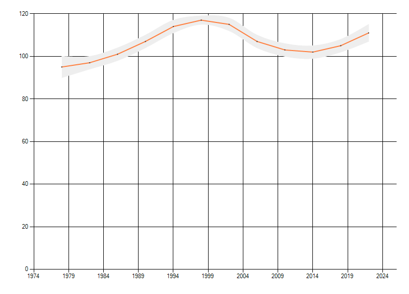 Gemiddelde trend van het aantal kilometerhokken waarin de soort voorkomt, weergegeven als indexcijfer (1975-1978 = 100).