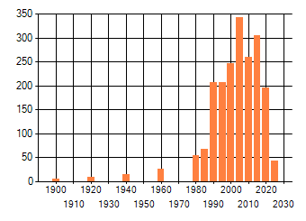 Het aantal atlasblokken (5x5 km) waarin de soort is gemeld binnen een periode van vijf jaar (vanaf 1980) of twintig jaar. Niet gecorrigeerd voor waarnemersinspanning en het aantal doorgegeven waarnemingen kan sterk variëren per periode, dus een trend in verspreiding kan hier niet direct uit worden afgelezen. Het opgegeven jaartal is het eerste jaar van de periode. Bron: gevalideerde waarnemingen uit de NDFF.