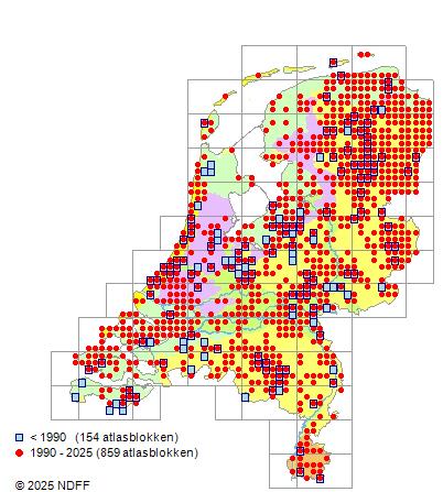 Het aantal atlasblokken (5x5 km) waarin de soort is gemeld binnen een periode van vijf jaar (vanaf 1980) of twintig jaar. Niet gecorrigeerd voor waarnemersinspanning en het aantal doorgegeven waarnemingen kan sterk variëren per periode, dus een trend in verspreiding kan hier niet direct uit worden afgelezen. Het opgegeven jaartal is het eerste jaar van de periode. Bron: gevalideerde waarnemingen uit de NDFF.