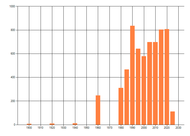 Het aantal atlasblokken (5x5 km) waarin de soort is gemeld binnen een periode van vijf jaar (vanaf 1980) of twintig jaar. Niet gecorrigeerd voor waarnemersinspanning en het aantal doorgegeven waarnemingen kan sterk variëren per periode, dus een trend in verspreiding kan hier niet direct uit worden afgelezen. Het opgegeven jaartal is het eerste jaar van de periode. Bron: gevalideerde waarnemingen uit de NDFF.