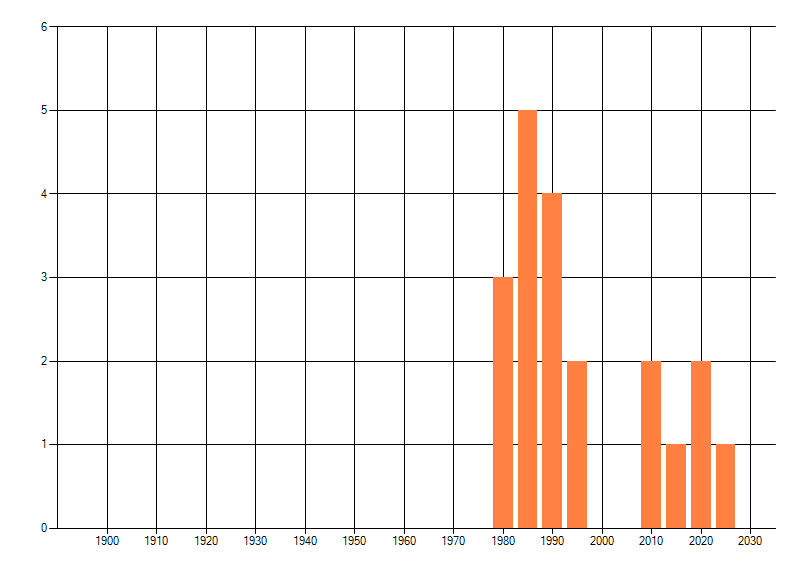 Het aantal atlasblokken (5x5 km) waarin de soort is gemeld binnen een periode van vijf jaar (vanaf 1980) of twintig jaar. Niet gecorrigeerd voor waarnemersinspanning en het aantal doorgegeven waarnemingen kan sterk variëren per periode, dus een trend in verspreiding kan hier niet direct uit worden afgelezen. Het opgegeven jaartal is het eerste jaar van de periode. Bron: gevalideerde waarnemingen uit de NDFF.