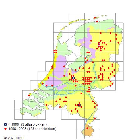 Het aantal atlasblokken (5x5 km) waarin de soort is gemeld binnen een periode van vijf jaar (vanaf 1980) of twintig jaar. Niet gecorrigeerd voor waarnemersinspanning en het aantal doorgegeven waarnemingen kan sterk variëren per periode, dus een trend in verspreiding kan hier niet direct uit worden afgelezen. Het opgegeven jaartal is het eerste jaar van de periode. Bron: gevalideerde waarnemingen uit de NDFF.