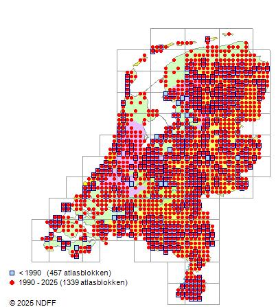 Het aantal atlasblokken (5x5 km) waarin de soort is gemeld binnen een periode van vijf jaar (vanaf 1980) of twintig jaar. Niet gecorrigeerd voor waarnemersinspanning en het aantal doorgegeven waarnemingen kan sterk variëren per periode, dus een trend in verspreiding kan hier niet direct uit worden afgelezen. Het opgegeven jaartal is het eerste jaar van de periode. Bron: gevalideerde waarnemingen uit de NDFF.