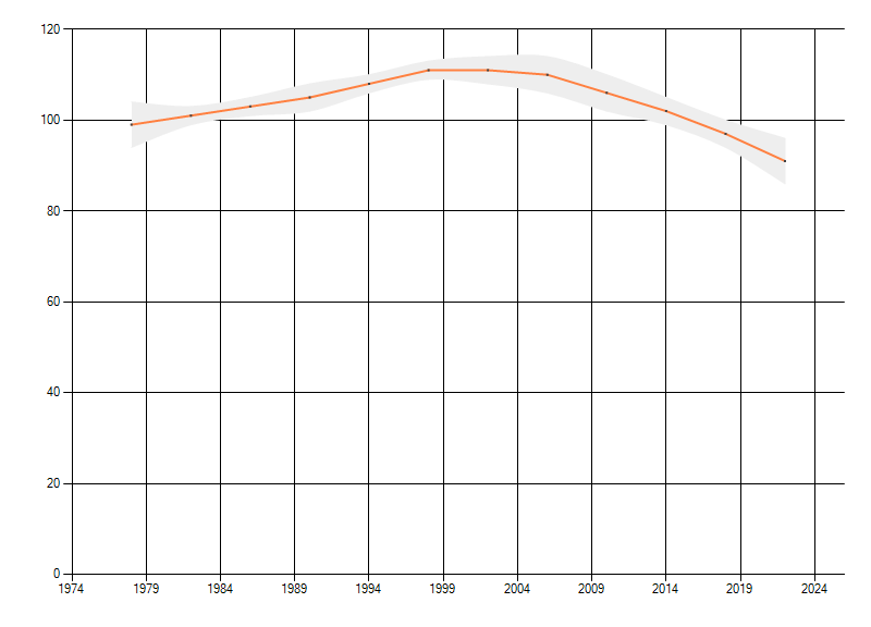 Gemiddelde trend van het aantal kilometerhokken waarin de soort voorkomt, weergegeven als indexcijfer (1975-1978 = 100).