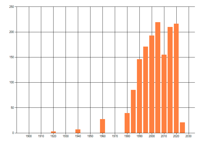 Het aantal atlasblokken (5x5 km) waarin de soort is gemeld binnen een periode van vijf jaar (vanaf 1980) of twintig jaar. Niet gecorrigeerd voor waarnemersinspanning en het aantal doorgegeven waarnemingen kan sterk variëren per periode, dus een trend in verspreiding kan hier niet direct uit worden afgelezen. Het opgegeven jaartal is het eerste jaar van de periode. Bron: gevalideerde waarnemingen uit de NDFF.