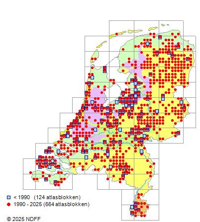 Het aantal atlasblokken (5x5 km) waarin de soort is gemeld binnen een periode van vijf jaar (vanaf 1980) of twintig jaar. Niet gecorrigeerd voor waarnemersinspanning en het aantal doorgegeven waarnemingen kan sterk variëren per periode, dus een trend in verspreiding kan hier niet direct uit worden afgelezen. Het opgegeven jaartal is het eerste jaar van de periode. Bron: gevalideerde waarnemingen uit de NDFF.
