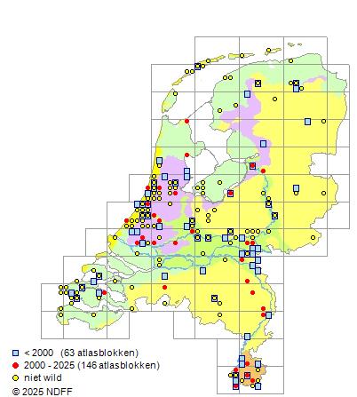 Het aantal atlasblokken (5x5 km) waarin de soort is gemeld binnen een periode van vijf jaar (vanaf 1980) of twintig jaar. Niet gecorrigeerd voor waarnemersinspanning en het aantal doorgegeven waarnemingen kan sterk variëren per periode, dus een trend in verspreiding kan hier niet direct uit worden afgelezen. Het opgegeven jaartal is het eerste jaar van de periode. Bron: gevalideerde waarnemingen uit de NDFF.