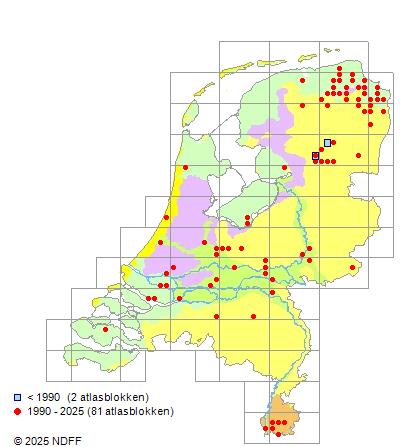 Het aantal atlasblokken (5x5 km) waarin de soort is gemeld binnen een periode van vijf jaar (vanaf 1980) of twintig jaar. Niet gecorrigeerd voor waarnemersinspanning en het aantal doorgegeven waarnemingen kan sterk variëren per periode, dus een trend in verspreiding kan hier niet direct uit worden afgelezen. Het opgegeven jaartal is het eerste jaar van de periode. Bron: gevalideerde waarnemingen uit de NDFF.