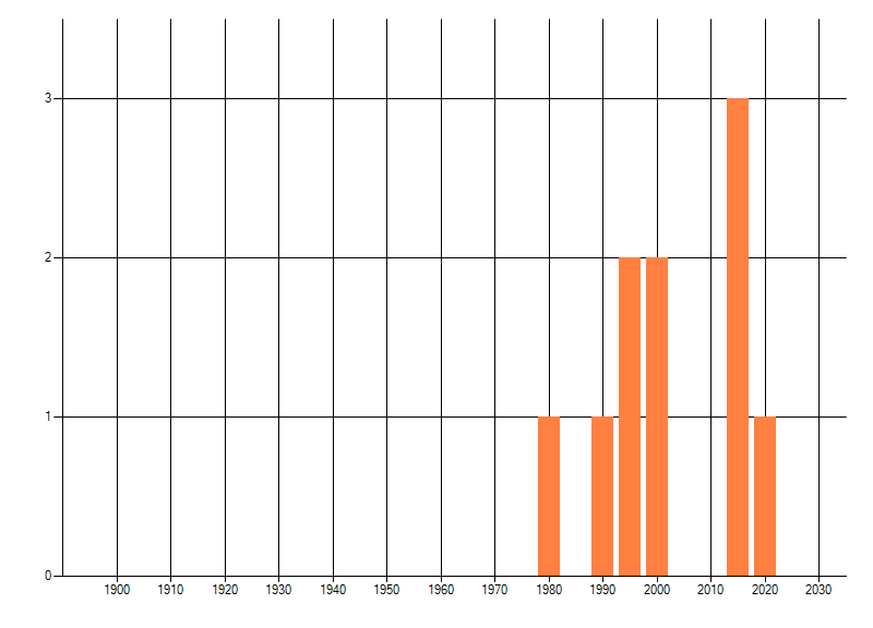 Het aantal atlasblokken (5x5 km) waarin de soort is gemeld binnen een periode van vijf jaar (vanaf 1980) of twintig jaar. Niet gecorrigeerd voor waarnemersinspanning en het aantal doorgegeven waarnemingen kan sterk variëren per periode, dus een trend in verspreiding kan hier niet direct uit worden afgelezen. Het opgegeven jaartal is het eerste jaar van de periode. Bron: gevalideerde waarnemingen uit de NDFF.