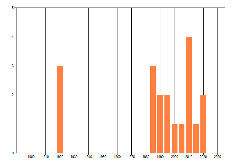 Het aantal atlasblokken (5x5 km) waarin de soort is gemeld binnen een periode van vijf jaar (vanaf 1980) of twintig jaar. Niet gecorrigeerd voor waarnemersinspanning en het aantal doorgegeven waarnemingen kan sterk variëren per periode, dus een trend in verspreiding kan hier niet direct uit worden afgelezen. Het opgegeven jaartal is het eerste jaar van de periode. Bron: gevalideerde waarnemingen uit de NDFF.