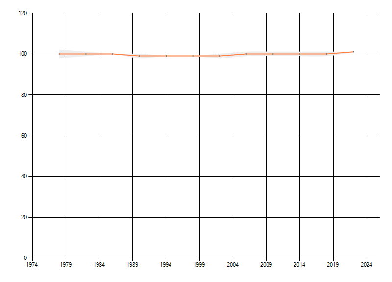 Gemiddelde trend van het aantal kilometerhokken waarin de soort voorkomt, weergegeven als indexcijfer (1975-1978 = 100).