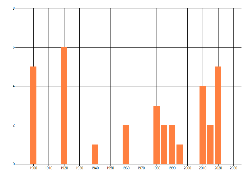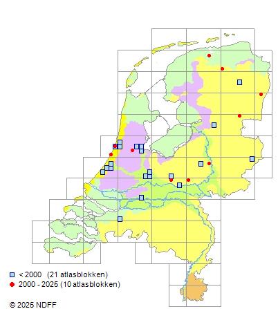 Het aantal atlasblokken (5x5 km) waarin de soort is gemeld binnen een periode van vijf jaar (vanaf 1980) of twintig jaar. Niet gecorrigeerd voor waarnemersinspanning en het aantal doorgegeven waarnemingen kan sterk variëren per periode, dus een trend in verspreiding kan hier niet direct uit worden afgelezen. Het opgegeven jaartal is het eerste jaar van de periode. Bron: gevalideerde waarnemingen uit de NDFF.