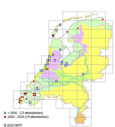 Het aantal atlasblokken (5x5 km) waarin de soort is gemeld binnen een periode van vijf jaar (vanaf 1980) of twintig jaar. Niet gecorrigeerd voor waarnemersinspanning en het aantal doorgegeven waarnemingen kan sterk variëren per periode, dus een trend in verspreiding kan hier niet direct uit worden afgelezen. Het opgegeven jaartal is het eerste jaar van de periode. Bron: gevalideerde waarnemingen uit de NDFF.