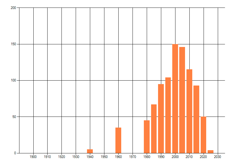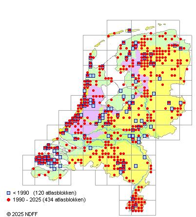 Het aantal atlasblokken (5x5 km) waarin de soort is gemeld binnen een periode van vijf jaar (vanaf 1980) of twintig jaar. Niet gecorrigeerd voor waarnemersinspanning en het aantal doorgegeven waarnemingen kan sterk variëren per periode, dus een trend in verspreiding kan hier niet direct uit worden afgelezen. Het opgegeven jaartal is het eerste jaar van de periode. Bron: gevalideerde waarnemingen uit de NDFF.
