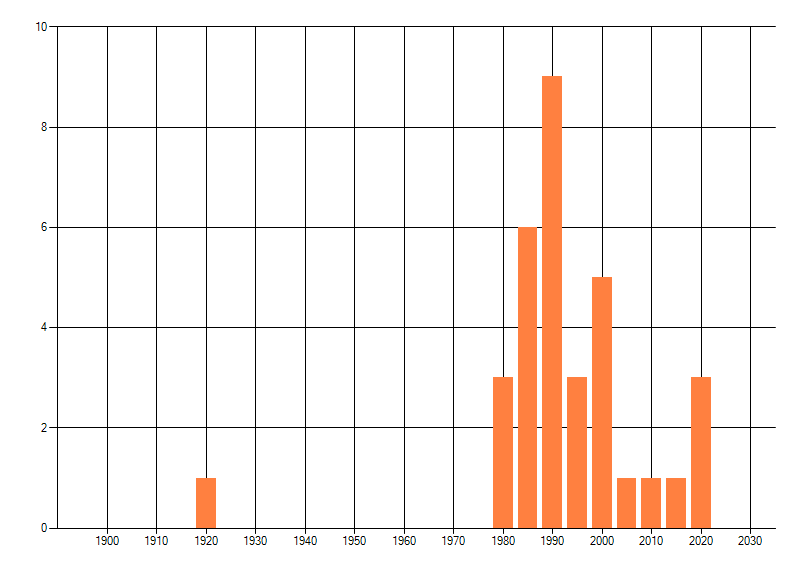Het aantal atlasblokken (5x5 km) waarin de soort is gemeld binnen een periode van vijf jaar (vanaf 1980) of twintig jaar. Niet gecorrigeerd voor waarnemersinspanning en het aantal doorgegeven waarnemingen kan sterk variëren per periode, dus een trend in verspreiding kan hier niet direct uit worden afgelezen. Het opgegeven jaartal is het eerste jaar van de periode. Bron: gevalideerde waarnemingen uit de NDFF.
